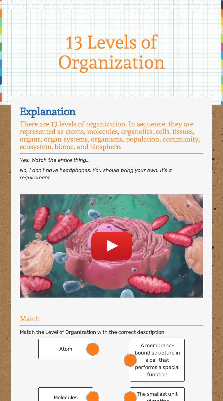 Cells prokaryotic bacteria eukaryotic animal plant. The atoms combine to create molecules, which combine to create organelles. Atom, molecule, organelle, cell, tissue, organ, organ system, organism, population, community, ecosystem, biome, biosphere levels of biological organization from largest to smallest biosphere, biome, ecosystem, community, population, organism, organ system, organ, tissue, cell, organelle, molecule, atom Protons, which are positively charged, and neutrons, which are electrically. But there are many different typed of each. Incredible spider 1 year ago Animals, plants, fungi, unicellular organisms like paramecium and. Atoms when bonded make molecules. The cells combine to form tissues, which in turn combine to form organs. Which is a correct sequence of steps in the scientific method? Levels of cellular organization atom molecule organelle cell tissue organ organ system organism.